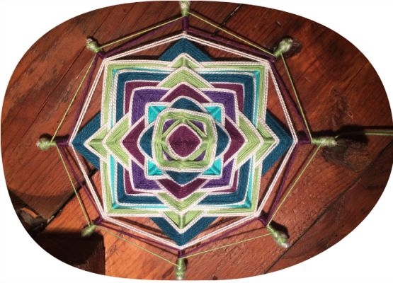 Il n'est pas nécessaire de s'inscrire pour plusieurs cercles, en une fois vous aurez l'occasion de réaliser déjà un bel Ojo de Dios simple (4 directions). Si vous vous lancez dans un ouvrage plus complexe vous devez prévoir 2 ou 3 cercles. Je ne conserve pas les ouvrages sur place entre deux cercles. Nous commençons toujours par un simple à 4 directions et de petite taille, avant de nous lancer dans un ouvrage plus complexe.
