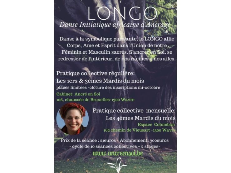 Danse à la symbolique puissante, qui allie Corps, Ame et Esprit dans l'Union de notre Féminin et Masculin sacrés. Le LONGO ancre et redresse de l'intérieur. ATTENTION changement de Lieu! le cours se donne au Cabinet d'Ancré en soi: 106 Chaussée de Bruxelles, 1300 Wavre. Les conditions restent inchangées.L'inscription la veille par SMS est obligatoire.
