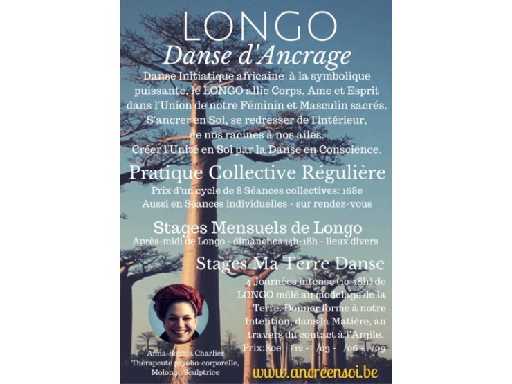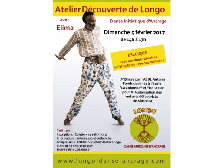 Il s'agit d'un atelier Découverte du Longo, Danse initiatique d'Ancrage, guidée par Elima, son créateur. Les recettes de cet atelier seront reversées intégralement au profit des enfants défavorisés de Kinshasa. L'organisation de cet atelier revient à Antarès asbl.